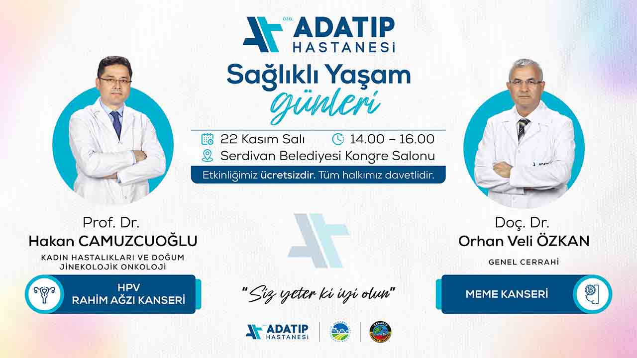 Özel Adatıp Hastanesi sosyal sorumluluk projeleri çerçevesinde, çalışmalarına devam ediyor ve Jinekolojik Onkoloji Cerrahisi Uzmanı Prof. Dr. Hakan Camuzcuoğlu ile Genel Cerrahi Uzmanı Doç. Dr. Orhan Veli Özkan’ı Sakaryalılarla buluşturuyor.