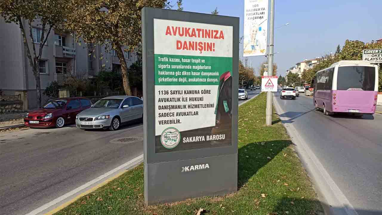 Sakarya Barosu, ‘avukatınıza danışın’ başlığı altında yaptırdığı afiş çalışmaları ile şehrin farklı noktalarındaki billboardlara ve raketlere ilan verdi. Verilen ilanlarda, vatandaşların hasar danışmanlık şirketlerine değil, avukata danışması gerektiği vurgulandı.