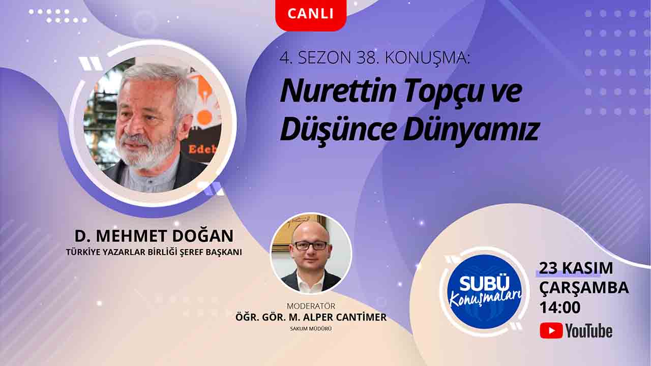 SUBÜ tarafından düzenlenen SUBÜ Konuşmaları’nın 38’inci konuşmacısı ‘Nurettin Topçu ve Düşünce Dünyamız’ başlıklı söyleşiyle Türkiye Yazarlar Birliği Şeref Başkanı D. Mehmet Doğan olacak.