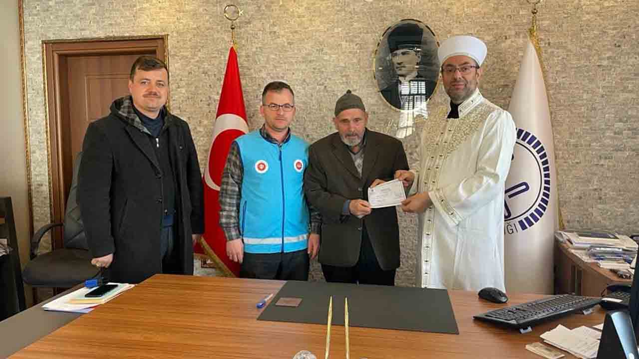 Taraklı İlçesi Alballar Mahallesi’nden Rüştü Güneş depremzedelerin ihtiyaçları için umreye gidecek parasını Türkiye Diyanet Vakfı Taraklı şubesine bağışlamıştı.