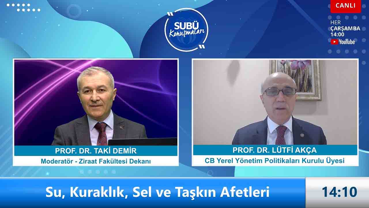 Sakarya Uygulamalı Bilimler Üniversitesi (SUBÜ) tarafından düzenlenen SUBÜ Konuşmaları’nın 45’inci konuşmacısı ‘Su, Kuraklık, Sel ve Taşkın Afetleri’ başlıklı söyleşiyle Cumhurbaşkanlığı Yerel Yönetim Politikaları Kurulu Üyesi Prof. Dr. Lütfi Akça oldu. Moderatörlüğünü Ziraat Fakültesi Dekanı Prof. Dr. Taki Demir’in üstlendiği söyleşide; Türkiye’nin su politikası, sel, taşkın ve kuraklık riskine karşı alınabilecek önlemler ile suyun tarım için önemi konuşuldu. Söyleşinin tamamı üniversitenin YouTube kanalı SUBÜ Haber’den tekrar izlenilebiliyor.